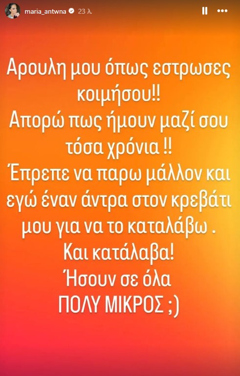 «Αρούλη μου όπως έστρωσες κοιμήσου! Απορώ πως ήμουν μαζί σου τόσα χρόνια. Έπρεπε να πάρω κι εγώ μάλλον έναν άντρα στο κρεβάτι μου για να το καταλάβω. Και κατάλαβα. Ήσουν σε όλα πολύ μικρός» έγραφε στο στόρι του λογαριασμού της Μαρίας Αντωνά.