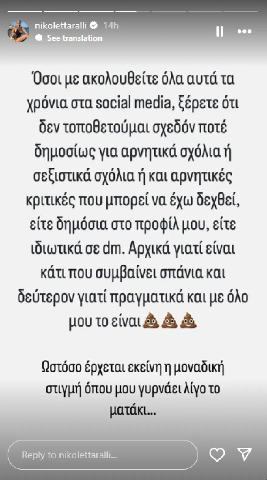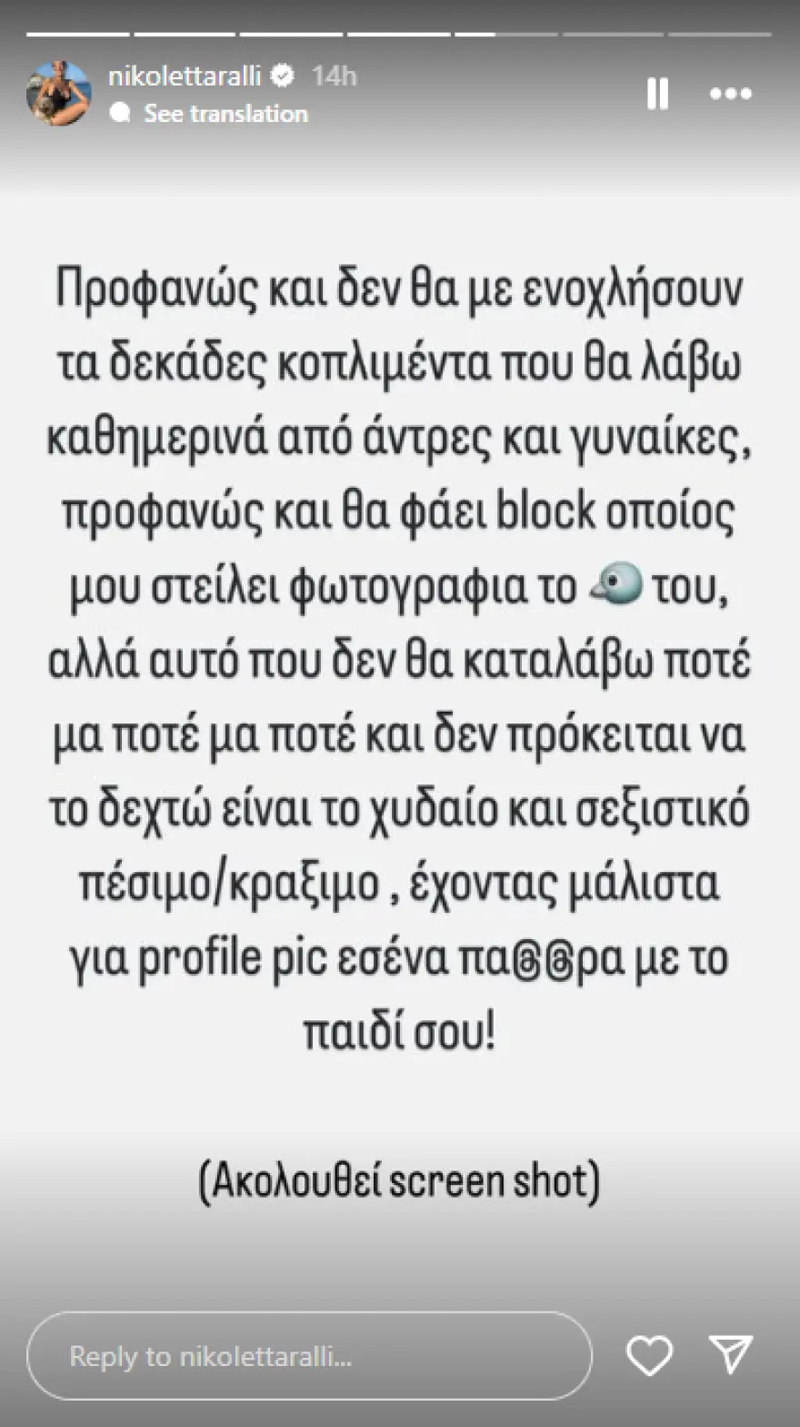 Αρχικά, η Νικολέττα περιέγραψε το περιστατικό και το σχόλιο που έλαβε, εκφράζοντας την απογοήτευσή της για τη συμπεριφορά του άντρα. «Όσοι με ακολουθείτε όλα αυτά τα χρόνια στα social media, ξέρετε ότι δεν τοποθετούμε σχεδόν ποτέ δημοσίως για αρνητικά σχόλια ή σεξιστικά σχόλια ή και αρνητικές κριτικές που μπορεί να έχω δεχτεί, είτε δημόσια στο προφίλ μου είτε ιδιωτικά σε dm. Αρχικά γιατί είναι κάτι που συμβαίνει σπάνια και δεύτερον γιατί πραγματικά και με όλο μου το είναι χ**ηκα. Ωστόσο έρχεται εκείνη μοναδική στιγμή που μου γυρνάει λίγο το ματάκι… Προφανώς και δεν θα με ενοχλήσουν τα δεκάδες κομπλιμέντα που θα λάβω καθημερινά από άντρες και γυναίκες, προφανώς και θα φάει μπλοκ όποιος μου στείλει φωτογραφία το πουλί του, αλλά αυτό που δεν θα καταλάβω ποτέ μα ποτέ μα ποτέ και δεν πρόκειται να το δεχτώ είναι το χυδαίο και σεξιστικό πέσιμο/κράξιμο, έχοντας μάλιστα για profile pic εσένα πα****ρα με το παιδί σου! (Ακολουθεί screenshot)».