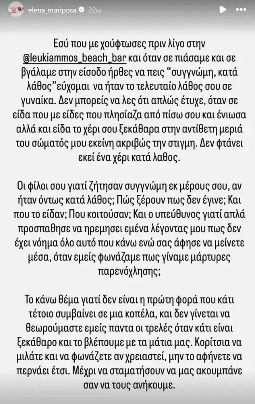 «Εσύ που με χούφτωσες πριν λίγο στην @leukiamnos_beach_bar και όταν σε πιάσαμε και σε βγάλαμε στην είσοδο ήρθες να πεις “συγγνώμη, κατά λάθος” εύχομαι να ήταν το τελευταίο λάθος σου σε γυναίκα.