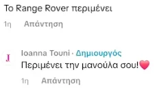 Η ένταση κλιμακώθηκε όταν ένας χρήστης σχολίασε ειρωνικά «Το Range Rover περιμένει». Η αντίδραση της Ιωάννας Τούνη ήταν άμεση και δηκτική, δείχνοντας ότι δεν αφήνει αναπάντητες τις προσβολές: «Περιμένει τη μανούλα σου». Η συγκεκριμένη απάντηση, αν και σκληρή, αποτυπώνει την κόπωση πολλών δημόσιων προσώπων απέναντι στην ατελείωτη κριτική και τα πικρόχολα σχόλια που δέχονται.