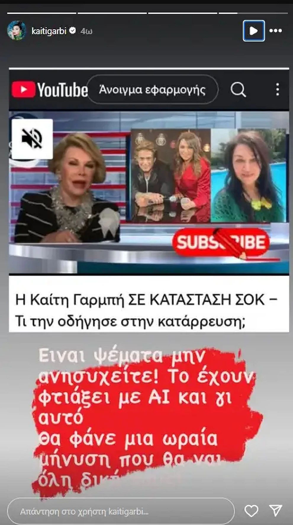 «Είναι ψέματα, μην ανησυχείτε! Το έχουν φτιάξει με AI και γι’ αυτό θα φάνε μια μήνυση που θα ‘ναι όλη δική τους!», έγραψε χαρακτηριστικά, δείχνοντας την πρόθεσή της να υπερασπιστεί την εικόνα και την υπόληψή της απέναντι στην παραπληροφόρηση που δημιουργείται από την τεχνολογία.