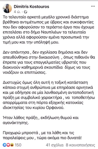 Όπως καταγγέλλει ο Δημήτρης Ορφανός, ο δήμαρχος στο Ναύπλιο, Δημήτρης Κωστούρος έριξε 22 φορές σκουπίδια και περιττώματα στην πόρτα του σπιτιού του ενώ κάνει λόγο και για απειλητικά σημειώματα.