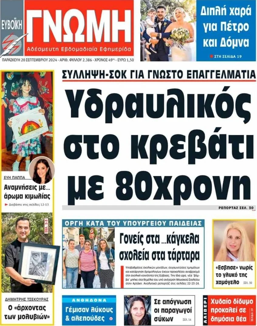 Χαμός στην Εύβοια: Υδραυλικός πιάστηκε στο κρεβάτι με 80χρονη… Μια απίθανη αποκάλυψη από την τοπική εφημερίδα «Ευβοϊκή Γνώμη» έχει προκαλέσει αίσθηση στη Χαλκίδα, αποκαλύπτοντας έναν απροσδόκητο λόγο για τη δυσκολία εύρεσης υδραυλικών στην περιοχή. Όπως αποκαλύπτεται, γνωστός υδραυλικός της περιοχής συνελήφθη επ’ αυτοφώρω στο κρεβάτι με μια 80χρονη γυναίκα!