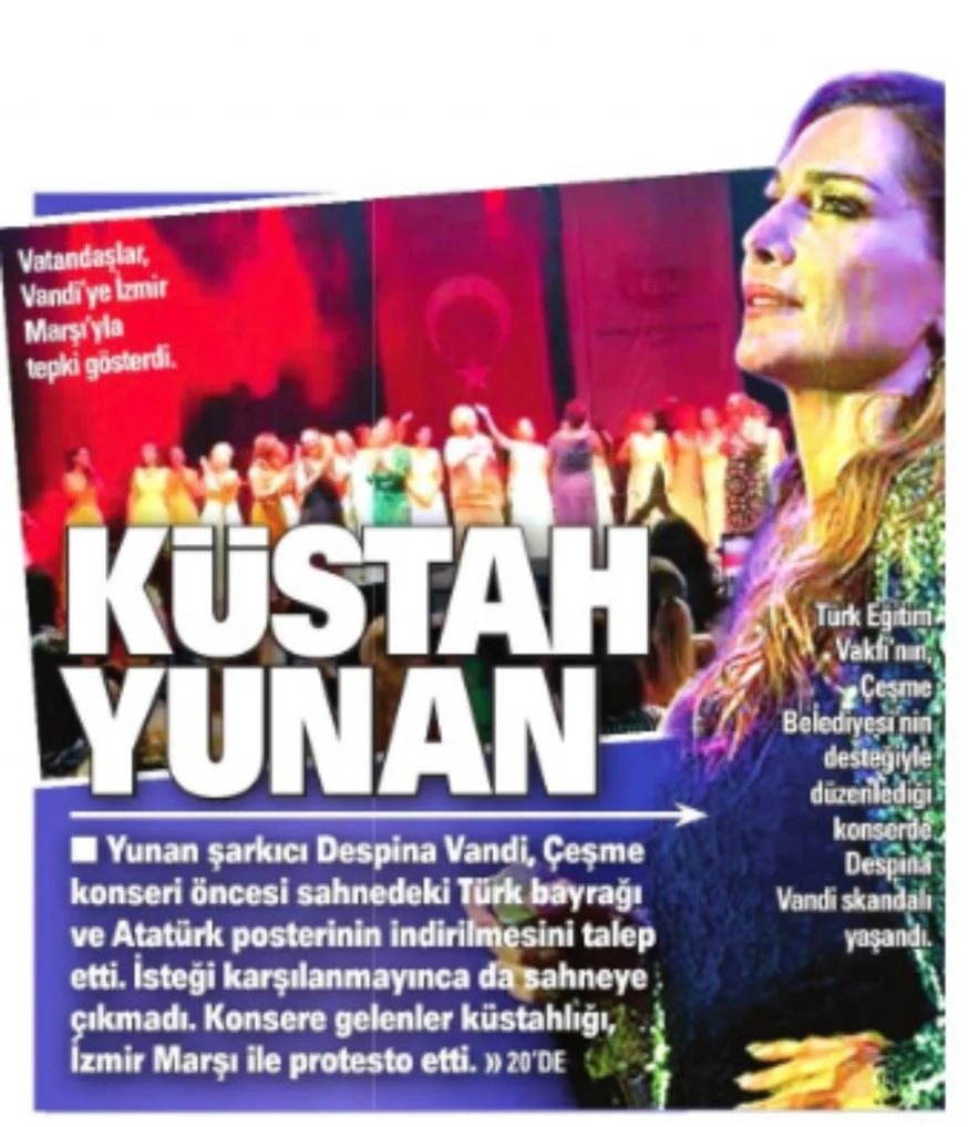 Χαμός στην Τουρκία με τη Δέσποινα Βανδή: Αισχρή επίθεση με αναφορές στη σφαγή της Σμύρνης – Η απόφαση της Δέσποινας Βανδής να μη συμμετάσχει στη συναυλία στο Τσεσμέ της Σμύρνης έλαβε μεγάλη προβολή στην Τουρκία, καθώς η τοποθέτησή της αντιμετωπίστηκε με προκλητικά σχόλια από τα τουρκικά ΜΜΕ. Ακόμη και η δήμαρχος της πόλης κατηγόρησε την τραγουδίστρια για την απόφασή της.