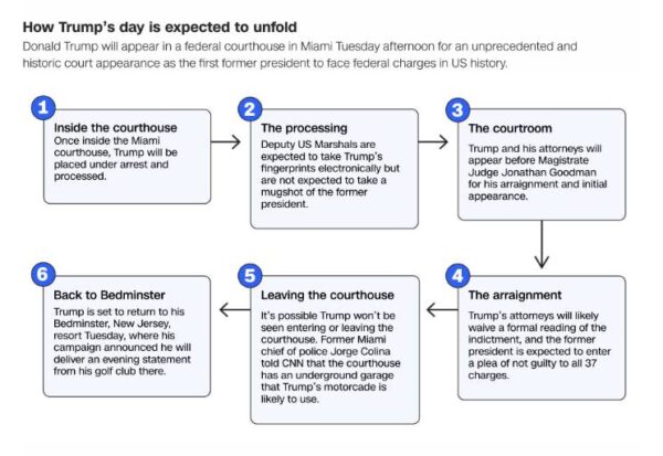 Στη συνέχεια ο πρώην πρόεδρος της Αμερικής θα δηλώσεις αθώος για όλες τις κατηγορίες και εν συνεχεία θα επιστρέψει στην εξοχική του κατοικία στο Νιού Τζέρσει από όπου και αναμένετε να απευθύνει μήνυμα στον αμερικανικό λαό.