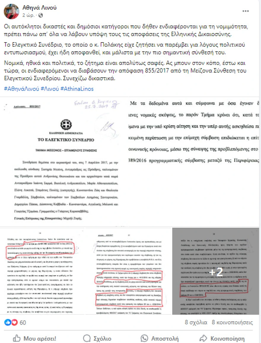Χαμός στο ΣΥΡΙΖΑ: Η Αθηνά Λινού κινείται δικαστικά κατά του Πολάκη… Η Αθηνά Λινού, μετά τη διαγραφή της από την Κοινοβουλευτική Ομάδα του ΣΥΡΙΖΑ, εμφανίζεται αποφασισμένη να συνεχίσει την κόντρα της με τον Παύλο Πολάκη σχετικά με το Ινστιτούτο «Prolepsis». Στην πρόσφατη ανάρτησή της στο Facebook, η Λινού παρουσιάζει έγγραφα που αφορούν την απόφαση της Μείζονος Σύνθεσης του Ελεγκτικού Συνεδρίου, επισημαίνοντας την ανάγκη να ληφθούν υπόψη οι αποφάσεις της Ελληνικής Δικαιοσύνης.