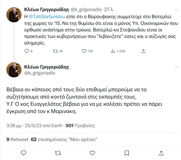 Επίθεση στην Τατιάνα Στεφανίδου και τον Νίκο Ευαγγελάτο έκανε ο υποψήφιος βουλευτής με το ΜέΡΑ Κ. Γρηγοριάδης.