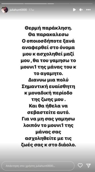 «Θερμή παράκληση. Θα παρακαλέσω ο οποιοσδήποτε ξανά αναφερθεί στο όνομα μου κ ασχοληθεί μαζί μου, θα του γ@μ#σω το μ@υν! της μάνας του και το αγ@μ#το. Διανύω μια πολύ σημαντική ευαίσθητη και μοναδική περίοδο της ζωής μου. Και θα ήθελα να σεβαστείτε αυτό. Για να μη σας γαμήσ@ λοιπόν το μουν! της μάνας σας ασχοληθείτε με τις ζωές σας και στο διάολο» έγραψε συγκεκριμένα η Τζούλια Αλεξανδράτου στον προσωπικό της λογαριασμό στο Instagram