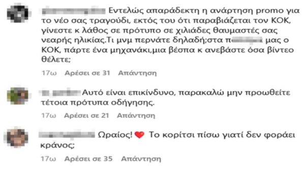 «Γίνεστε λάθος πρότυπο σε χιλιάδες θαυμαστές σας νεαρής ηλικίας, αυτό είναι επικίνδυνο. Παρακαλώ μην προωθείτε τέτοια πρότυπα οδήγησης» γράφουν μεταξύ άλλων στα σχόλια οι ακόλουθοι του Γιώργου Μαζωνάκη.