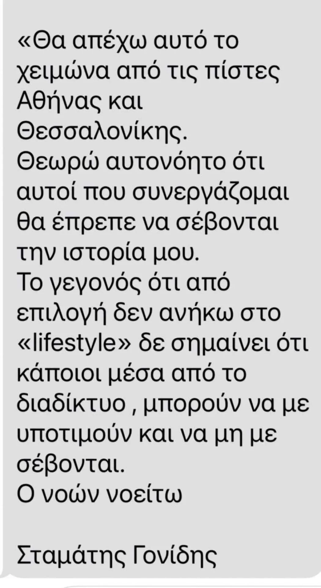 Στην ανάρτησή του, ο Γονίδης ανέφερε χαρακτηριστικά: «Θεωρώ ότι αυτοί που συνεργάζομαι θα έπρεπε να σέβονται την ιστορία μου. Το γεγονός ότι από επιλογή δεν ανήκω στο lifestyle δεν σημαίνει ότι κάποιοι μέσα από το διαδίκτυο μπορούν να με υποτιμούν και να μην με σέβονται. Ο νοών νοείτω».