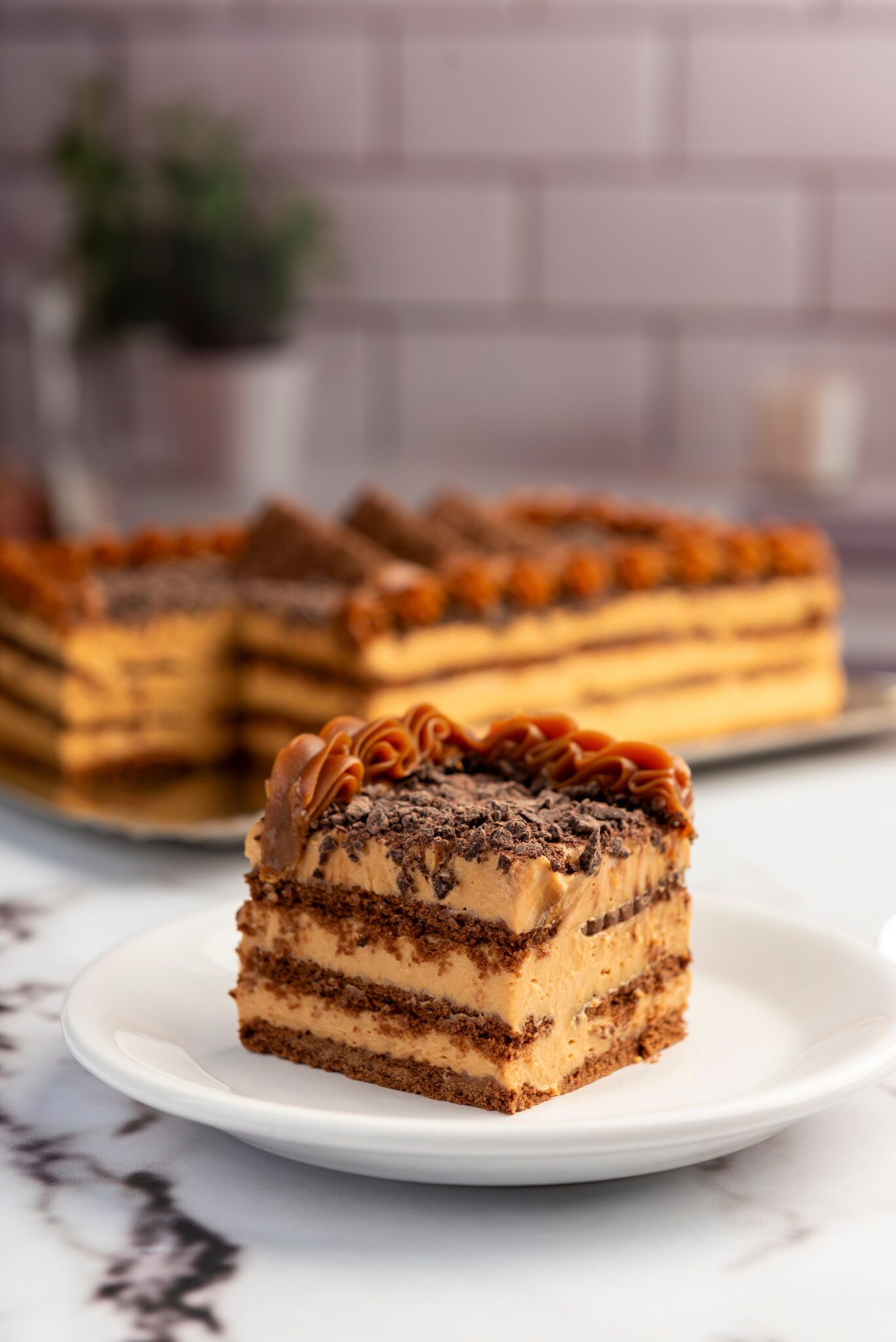 Σερβίρισμα: Έπειτα αναποδογυρίζουμε την τούρτα σε πιατέλα, αφαιρούμε τη μεμβράνη και την καλύπτουμε με το μείγμα dulce de leche που είχαμε κρατήσει. Επιπλέον πασπαλίζουμε με κακάο σε σκόνη για το τέλειο φινίρισμα.