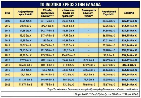 Τα στοιχεία, πάντως, στην πράξη είναι πολύ διαφορετικά: το «κόκκινο» ιδιωτικό χρέος βρίσκεται πάνω από τα 380 δισ.. ευρώ, όσο είναι δηλαδή και το δημόσιο χρέος, και συγκεκριμένα: