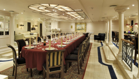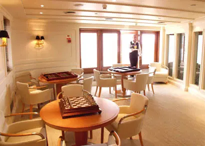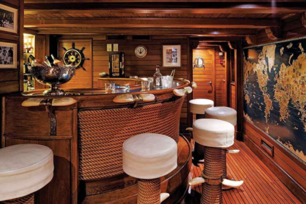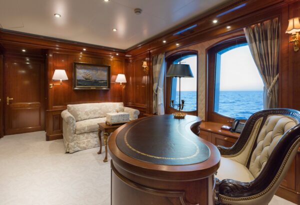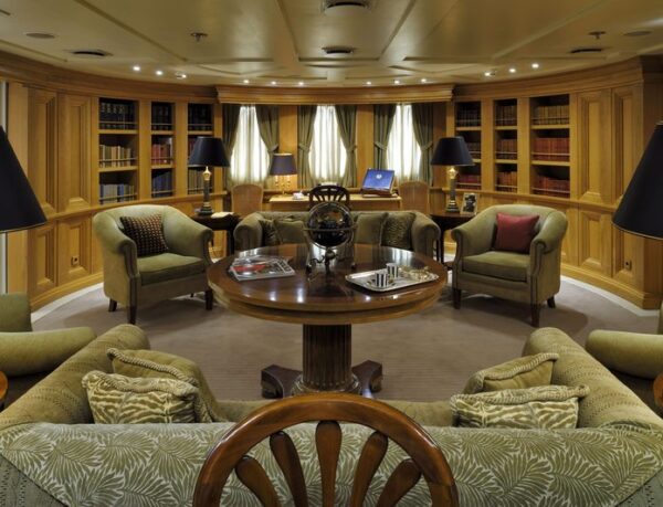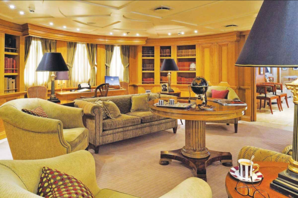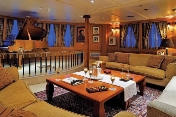 Από την άλλη, το ξύλινο σαλόνι Jackie O Lapis Lounge στο κεντρικό κατάστρωμα -που πήρε το όνομά του από ένα τζάκι από λάπις λάζουλι που φημολογείται ότι κόστισε αδρά- είναι εξοπλισμένο με σπάνια βιβλία και ένα ηλεκτρικό πιάνο που παίζει μόνο του, ενώ οι ρέπλικες πινάκων El Greco που ο Ωνάσης κρεμούσε κατά τη διάρκεια της ιδιοκτησίας του έχουν αντικατασταθεί με αληθινά αριστουργήματα των Renoir, Le Corbusier και Chirico.