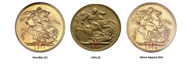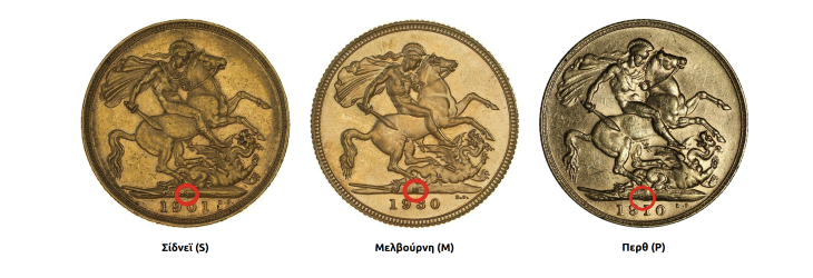 Οι χρυσές λίρες εκδίδονται από επτά νομισματοκοπεία, με τα περισσότερα νομίσματα να προέρχονται από το Λονδίνο. Τα υπόλοιπα νομισματοκοπεία – Σίδνεϊ, Μελβούρνη, Περθ, Οττάβα, Βομβάη και Πρετόρια – χρησιμοποιούσαν μικρά γράμματα ως σήμανση στην οπίσθια όψη για να υποδείξουν την προέλευση του νομίσματος.