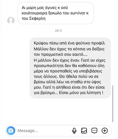 «Αϊ μαρή μας έγινες και εσύ κουλτουριάρα! Ξέκωλ@ του Survivor και του Σεφερλή», της έγραψε κάποιος στο Instagram.