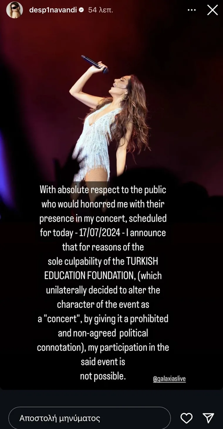Όπως υπογράμμισε η τραγουδίστρια, σε ανάρτησή της στον προσωπικό της λογαριασμό στο instagram, για το περιστατικό: «Με απόλυτο σεβασμό στο κοινό που θα με τιμούσε με την παρουσία του στην προγραμματισμένη για σήμερα συναυλία μου, ανακοινώνω ότι για λόγους που έχουν σχέση με την αποκλειστική ευθύνη του Τουρκικού Εκπαιδευτικού Ιδρύματος (το οποίο μονομερώς αποφάσισε να αλλοιώσει τον χαρακτήρα της εκδήλωσης ως συναυλία, δίνοντάς της μία απαγορευμένη και μη συμφωνημένη πολιτική διάσταση) δεν είναι δυνατή η συμμετοχή μου στη συγκεκριμένη εκδήλωση».
