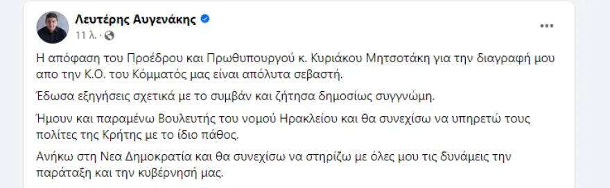«Η απόφαση του Προέδρου και Πρωθυπουργού κ. Κυριάκου Μητσοτάκη για την διαγραφή μου απο την Κ.Ο. του Κόμματός μας είναι απόλυτα σεβαστή. Έδωσα εξηγήσεις σχετικά με το συμβάν και ζήτησα δημοσίως συγγνώμη.