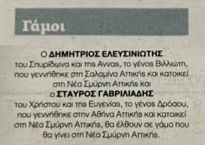 «Ο Δημήτριος Ελευσινιώτης του Σπυρίδωνα και της Άννας, το γένος Βυλλιώτη που γεννήθηκε στη Σαλαμίνα Αττικής και κατοικεί στη Νέα Σμύρνη Αττικής και ο Σταύρος Γαβριηλίδης του Χρήστου και της Ευγενίας, το γένος Δρόσου, που γεννήθηκε στην Αθήνα Αττικής και κατοικεί στη Νέα Σμύρνη, θα έλθουν σε γάμο που θα γίνει στη Νέα Σμύρνη Αττικής», αναφέρει η αγγελία.