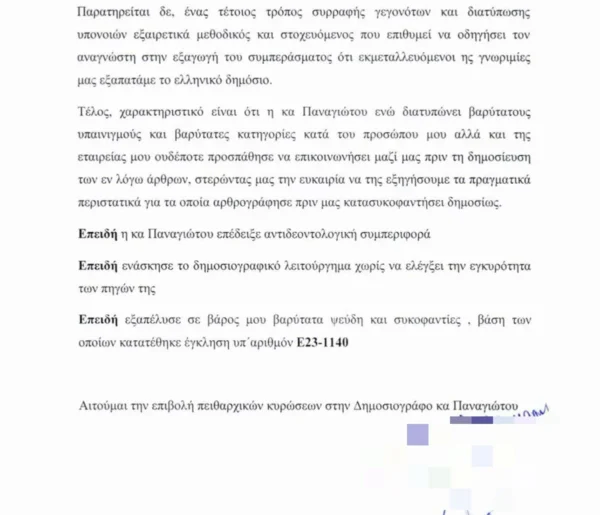 Στο σχετικό έγγραφο που στάλθηκε στην δημοσιογράφο από τον κ. Κολομπανί αναφέρεται μεταξύ άλλων πως έκανε, μάλιστα, συρραφή γεγονότων. Και αφήνει υπαινιγμούς και κατηγορίες εναντίον του ιδίου και της εταιρείας του. Ενώ δεν άσκησε το δημοσιογραφικό λειτούργημα όπως πρέπει καθώς δεν επικοινώνησε μαζί του για εξηγήσεις!