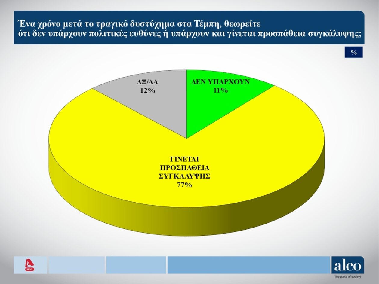 Δεν καταλαγιάζει η οργή των πολιτών αναφορικά με τις ευθύνες για το τραγικό δυστύχημα των Τεμπών την 28η Φεβρουαρίου… 2023, αφού το 77% των πολιτών θεωρεί πως υπάρχουν πολιτικές ευθύνες και γίνεται προσπάθεια συγκάλυψης, σύμφωνα με δημοσκόπηση της… ALCO, τα στοιχεία της οποίας δημοσιοποιήθηκαν στο αποψινό (07/03) κεντρικό δελτίο του ALPHA.