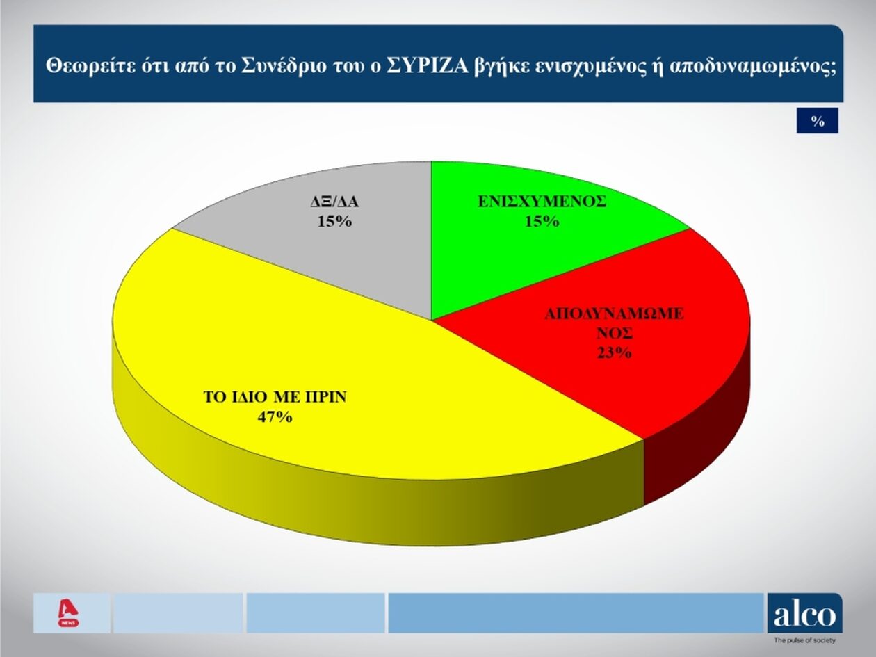 Μετά τις καταιγιστικές εξελίξεις στο κόμμα της αξιωματικής αντιπολίτευσης κατά τη διάρκεια του… επεισοδιακού Συνεδρίου, το 57% λέει ότι ο ΣΥΡΙΖΑ «βγήκε» ενισχυμένος μετά τη διαδικασία, ωστόσο, δεν φαίνεται πως άλλαξε ούτε η εκλογική του δύναμη, αλλά ούτε και η αρνητική άποψη του κόσμου για τον Στέφανο Κασσελάκη.