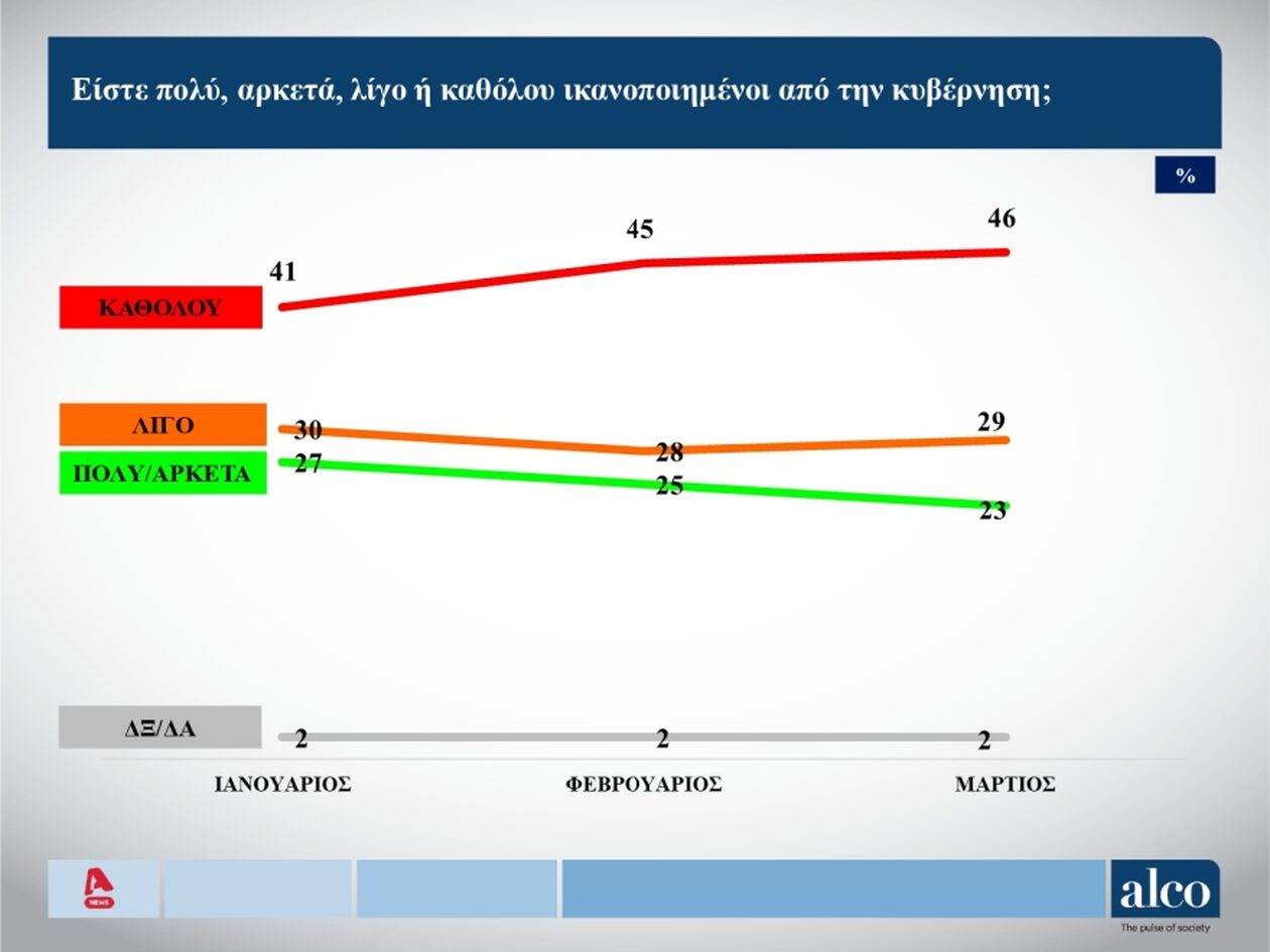 Παρά τις σημαντικές απώλειες, η… Νέα Δημοκρατία παραμένει πρώτη στην πρόθεση ψήφου και μάλιστα, διατηρώντας το διψήφιο ποσοστό της διαφοράς από το… 2οΠΑΣΟΚ – Κίνημα Αλλαγής, σύμφωνα με δημοσκόπηση της ALCO.
