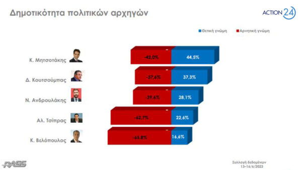 Σε ό,τι αφορά τους επιμέρους δείκτες, η εικόνα του Κυριάκου Μητσοτάκη υπερέχει αυτής του Αλέξη Τσίπρα. Είναι χαρακτηριστικό ότι στην καταλληλότητα για την πρωθυπουργία ο Κυριάκος Μητσοτάκης προηγείται με διαφορά 31,4 μονάδες του Αλέξη Τσίπρα.