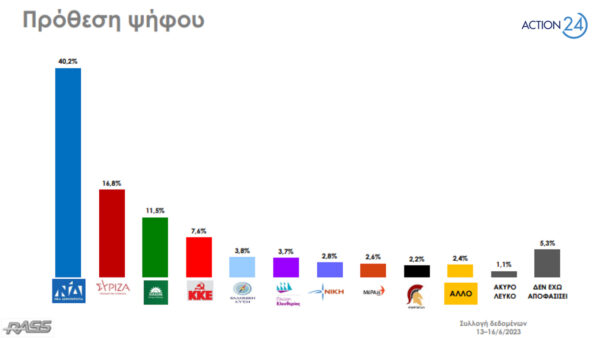 Σύμφωνα με την δημοσκόπηση η ΝΔ συγκεντρώνει στην πρόθεση ψήφου ποσοστό 40,2%. Ένα ποσοστό που πιθανότατα θα της δώσει αυτοδυναμία και δεν θα οδηγηθεί η χώρα σε τρίτες κάλπες.