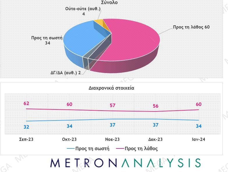 Για την πορεία της χώρας το 60% απάντησε ότι πηγαίνει προς τη λάθος κατεύθυνση ενώ το 34% ότι πάει προς τη σωστή κατεύθυνση.