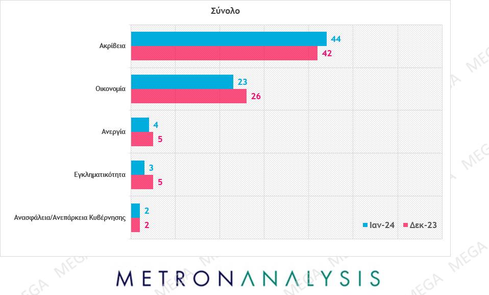Τα πέντε σημαντικότερα προβλήματα της χώρας είναι πρώτα η ακρίβεια, η οικονομία, η ανεργία, η εγκληματικότητα και πέμπτο η ανασφάλεια και ανεπάρκεια της κυβέρνησης.