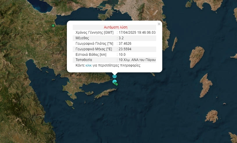 Διπλός σεισμός σημειώθηκε πριν από λίγο στον Πόρο και ταρακούνησε μέχρι και την Αττική προκαλώντας μεγάλη ανησυχία… Το επίκεντρο και η ένταση σύμφωνα με το Γεωδυναμικό Ινστιτούτο Αθηνών