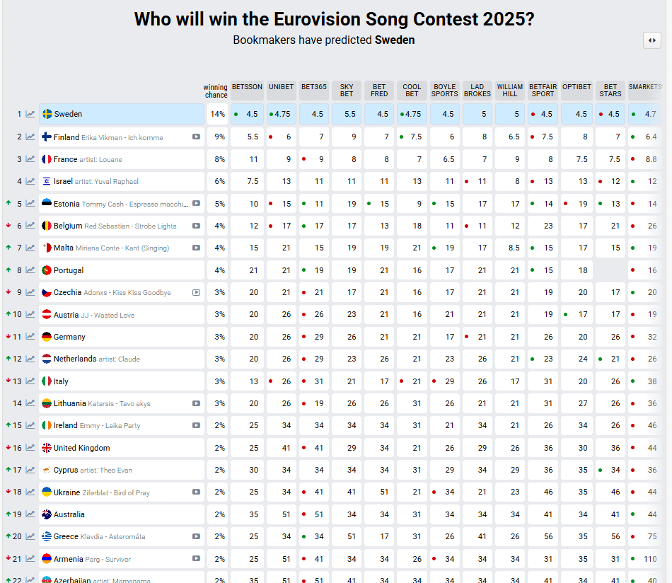 Στην κορυφή των προβλέψεων παραμένει η Σουηδία, ενώ ακολουθούν η Φινλανδία, η Γαλλία και το Ισραήλ. Αυτές οι χώρες έχουν καταφέρει να διατηρήσουν τη δημοτικότητά τους και να κερδίσουν την εμπιστοσύνη των στοιχηματικών εταιρειών.