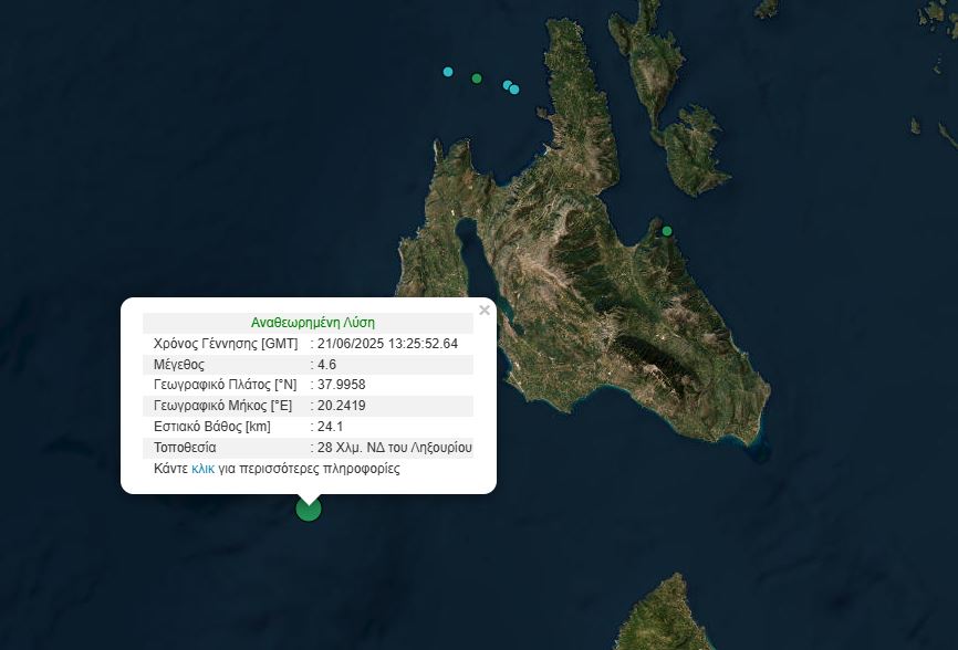 Δυνατός σεισμός μεγέθους 4,6 Ρίχτερ σημειώθηκε το απόγευμα του Σαββάτου, 21 Ιουνίου 2025, στην Κεφαλονιά, προκαλώντας ανησυχία στους κατοίκους του νησιού. Σύμφωνα με το Γεωδυναμικό Ινστιτούτο, το επίκεντρο της σεισμικής δόνησης εντοπίστηκε στην θαλάσσια περιοχή 28 χιλιόμετρα νοτιοδυτικά του Ληξουρίου, με το εστιακό βάθος να υπολογίζεται στα 24,1 χιλιόμετρα.