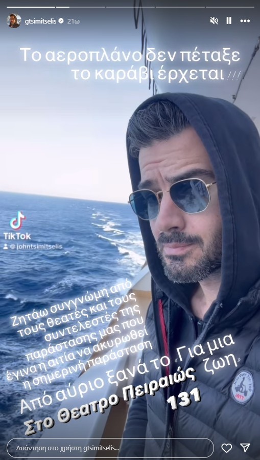 «Ζητάω συγγνώμη από τους θεατές και τους συντελεστές της παράστασής μας που έγινα η αιτία να ακυρωθεί η σημερινή παράσταση. Από αύριο ξανά “Για μια Ζωή” στο θέατρο Πειραιώς 131. Το αεροπλάνο δεν πέταξε, το καράβι έρχεται», ανακοίνωσε ο Γιάννης Τσιμιτσέλης.