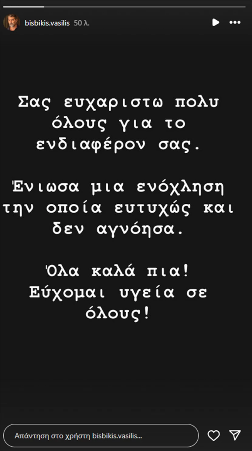 Ο Βασίλης Μπισμπίκης, μετά την περιπέτεια που αντιμετώπισε με την υγεία του, ανταποκρίθηκε στην ανάγκη να επικοινωνήσει με τους ακόλουθούς του στα μέσα κοινωνικής δικτύωσης μέσω μιας ανάρτησης στην προσωπική του σελίδα στο Instagram.