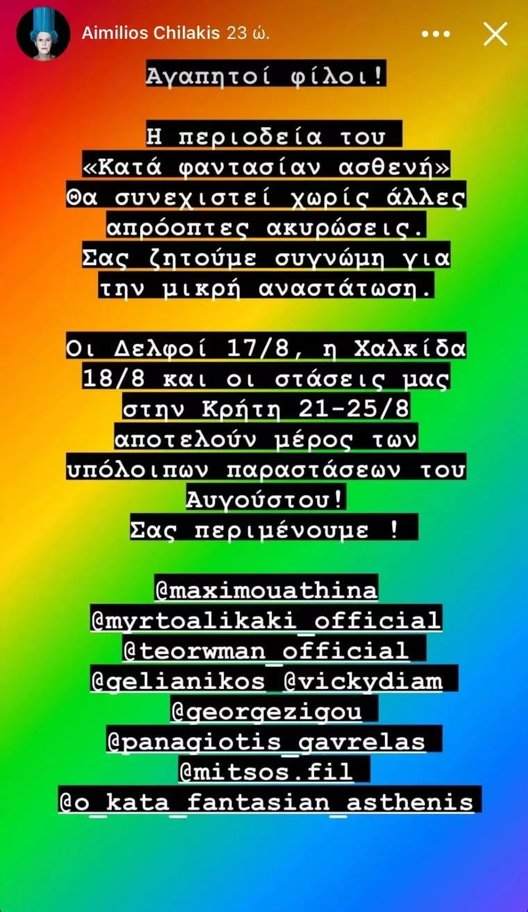 «Αγαπητοί φίλοι, η περιοδεία του «Κατά φαντασίαν ασθενή» θα συνεχιστεί χωρίς άλλες απρόοπτες ακυρώσεις. Σας ζητούμε συγνώμη για τη μικρή αναστάτωση. Οι Δελφοί 17/8, η Χαλκίδα 18/8 και οι στάσεις μας στην Κρήτη 21-25/8 αποτελούν μέρος των υπόλοιπων παραστάσεων του Αυγούστου. Σας περιμένουμε!», έγραψε χαρακτηριστικά ο Αιμίλιος Χειλάκης.