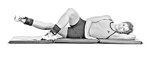 -Φορώντας και πάλι βάρος στον αστράγαλο, ξαπλώστε στο πλάι όπως στην 1η εικόνα. Λυγίστε το γόνατο του επάνω ποδιού σας, τοποθετώντας το μπροστά από το γόνατο του ποδιού που είναι κάτω. Το κάτω πόδι σας θα πρέπει να είναι σε πλήρη έκταση.