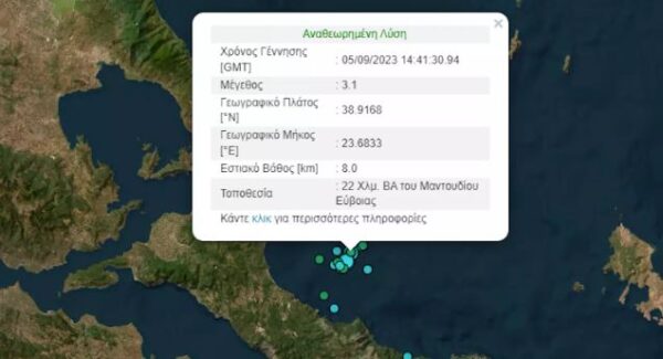 Συνεχείς σεισμικές δονήσεις σημειώνονται τις τελευταίες ώρες κοντά στο Μαντούδι στην Εύβοια. Ο πιο δυνατός από τους σεισμούς είναι της τάξης των 3,1 βαθμών της κλίμακας Ρίχτερ.