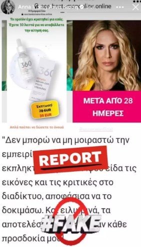 «Παρακαλώ μην πατάτε σε συνδέσμους που χρησιμοποιούν το όνομα της Άννας Βίσση για να «πουλήσουν» δήθεν προϊόντα. Αναφορά και διαγραφή», έγραψε η Άννα Βίσση στην ανάρτησή της.