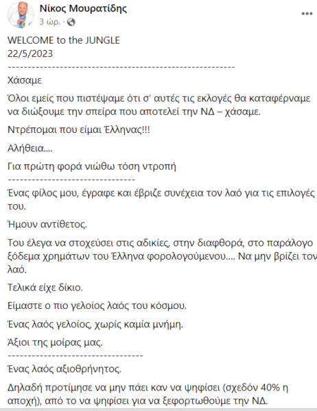 «Welcome to the jungle 22/5/2023. Χάσαμε. Όλοι εμείς που πιστέψαμε ότι σ’ αυτές τις εκλογές θα καταφέρναμε να διώξουμε τη σπείρα που αποτελεί τη ΝΔ – χάσαμε. Ντρέπομαι που είμαι Έλληνας! Αλήθεια. Για πρώτη φορά νιώθω τόση ντροπή», έγραψε χαρακτηριστικά.