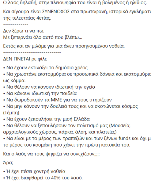 «Εκτός του ότι το κοινό παραπλανήθηκε, έχει επίσης διαφθαρεί. 4 χρόνια δεν ξέρουμε τι έχει γίνει παρασκηνιακά, ποιοι έχουν φάει τόσα εκατομμύρια, τόσα δισεκατομμύρια. Μιλάμε για έναν διεφθαρμένο λαό», γράφει στη συνέχεια ο ραδιοφωνικός παραγωγός.