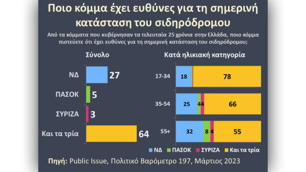 Σε σχέση με το δυστύχημα στα Τέμπη το 64% επιρρίπτει ευθύνη σε ΝΔ, ΣΥΡΙΖΑ και ΠΑΣΟΚ για την σημερινή κατάσταση του σιδηρόδρομου. Καταρρίπτοντας την προσπάθεια να χρεωθεί το έγκλημα με 57 νεκρούς σε ανθρώπινο λάθος. Αλλά και στην επιχείρηση συγκάλυψης των ευθυνών. Στην οποία επιδίδονται, μάλιστα, τόσο η κυβέρνηση της ΝΔ, όσο και ο ΣΥΡΙΖΑ και το ΠΑΣΟΚ.