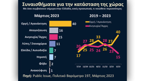 Σύμφωνα με την έρευνα, τα αισθήματα που κυριαρχούν σήμερα στην Ελληνική κοινωνία, καταγράφεται πώς το 40% νιώθει οργή και αγανάκτηση. Διαφοροποιημένα σε σχέση με προηγούμενες έρευνες της ίδιας εταιρείας.