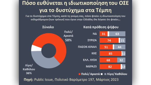 Το 58% θεωρεί ότι «πολύ» και «αρκετά» ευθύνεται η ιδιωτικοποίηση του ΟΣΕ για το δυστύχημα στα Τέμπη. Αξίζει να σημειωθεί ότι αυτή την άποψη έχει το 70% των ψηφοφόρων του ΣΥΡΙΖΑ. Ο οποίος ως συγκυβέρνηση με τους ΑΝΕΛ ολοκλήρωσε την εξαγορά της ΤΡΑΙΝΟΣΕ από την ιταλική εταιρεία. Ενώ την ίδια άποψη έχει και το 30% των ψηφοφόρων της ΝΔ.