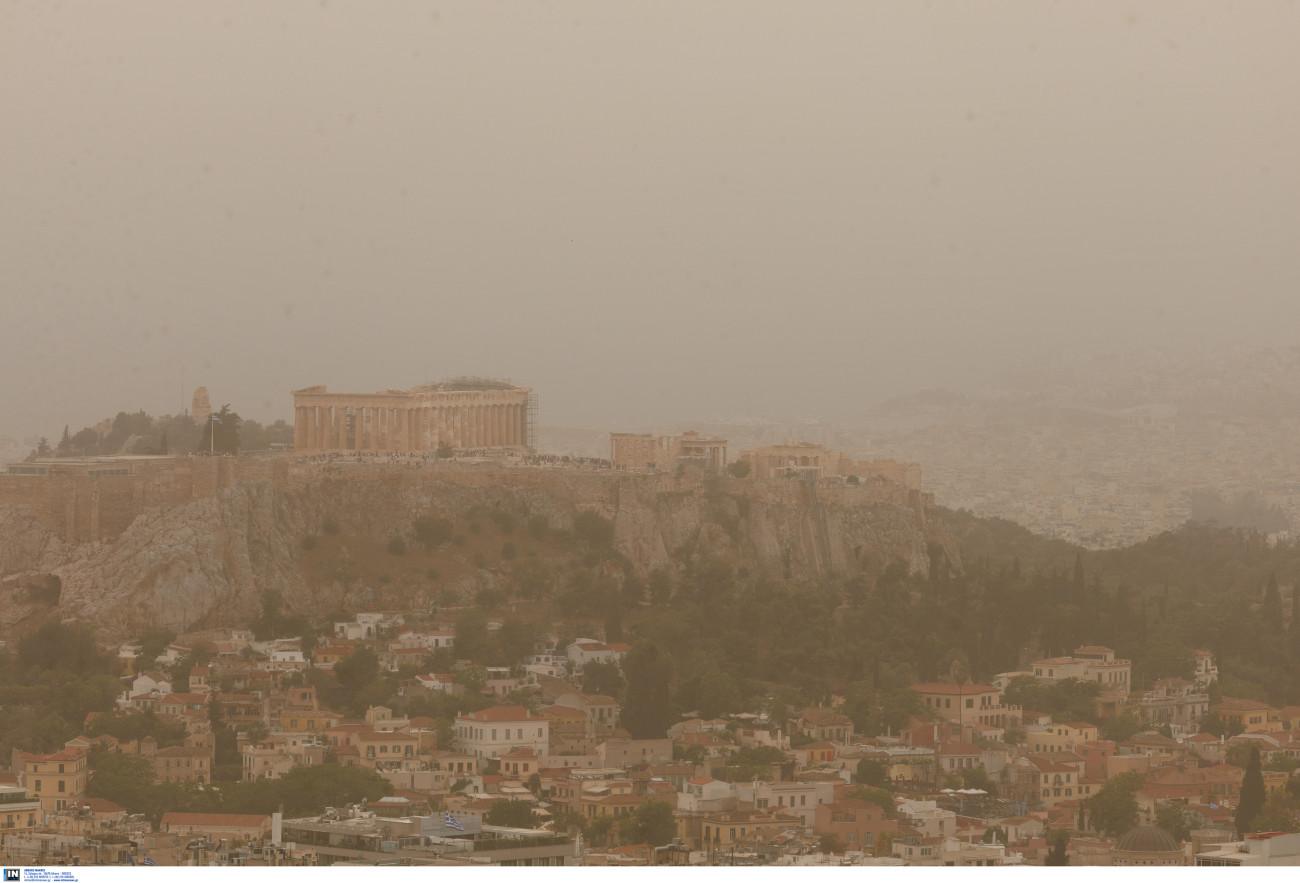 Μνημεία όπως η Ακρόπολη και άλλα εμβληματικά σημεία της Αθήνας «εξαφανίστηκαν» κάτω από ένα γκρίζο πέπλο σκόνης. Δημιουργώντας ένα σουρεαλιστικό σκηνικό. Η ημέρα έγινε ξαφνικά σκοτεινή στην Αττική.