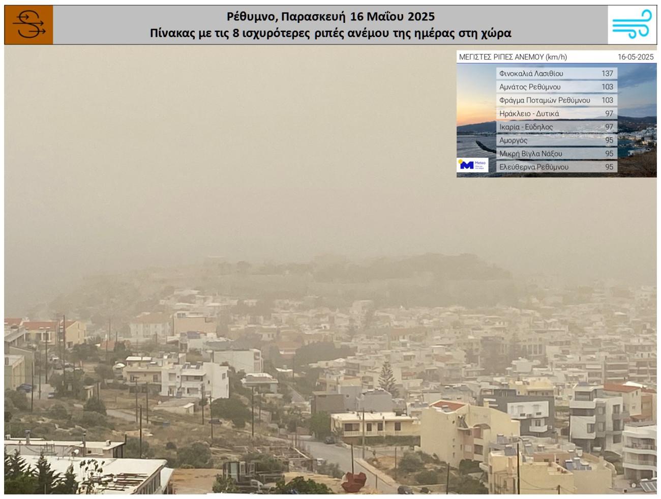 Επιπλέον μια φωτογραφία από το Ρέθυμνο αποδεικνύει τις πολύ υψηλές συγκεντρώσεις σκόνης. Ενώ ένας πίνακας παρουσιάζει τις 8 ισχυρότερες ριπές ανέμου που καταγράφηκαν την ίδια ημέρα.