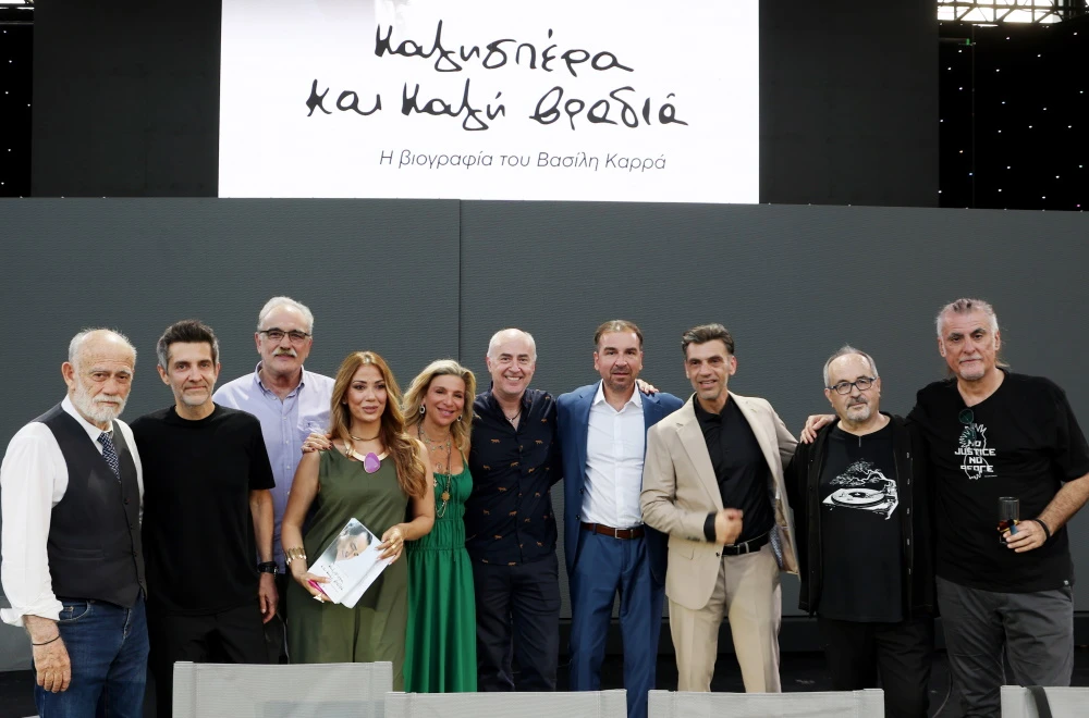 Ειρήνη Κεσογλίδου: Σπάνια εμφάνιση της κόρης του Βασίλη Καρρά! Η βιογραφία του Βασίλη Καρρά, γνωστού ως «άρχοντα», με τίτλο «Καλησπέρα και καλή βραδιά», παρουσιάστηκε το απόγευμα της Δευτέρας στο Θέατρο Άλσος. Στην παρουσίαση μίλησαν ο βιογράφος Θάνος Κανούσης, ο δημοσιογράφος και συγγραφέας Γιώργος Λιάνης, η διευθύνων σύμβουλος της Minos EMI Universal Μαργαρίτα Μάτσα, ο τραγουδοποιός Φίλιππος Πλιάτσικας και ο συνθέτης Φοίβος, αναφερόμενοι στον Βασίλη Καρρά και το βιβλίο.