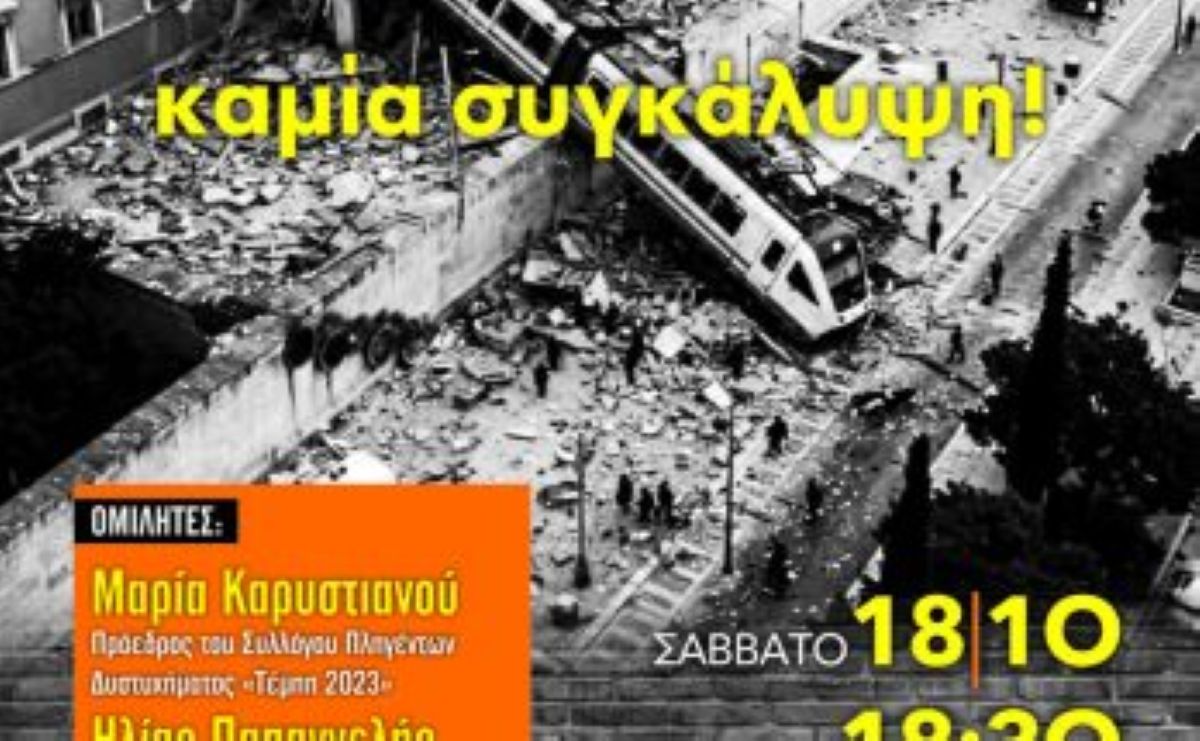 Ο Α’ Σύλλογος Αθηνών διοργανώνει εκδήλωση-μνήμη για το έγκλημα των Τεμπών. Εκφράζοντας την αντίθεσή του στην «επιχείρηση συγκάλυψης» της υπόθεσης και την αλληλεγγύη του στους συγγενείς των θυμάτων που αγωνίζονται. Συμπεριλαμβανομένου του απεργού πείνας Πάνου Ρούτσι.