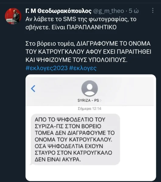 «Ο μηχανισμός προπαγάνδας της ΝΔ διακινεί “οδηγίες” για να βγουν άκυρα ψηφοδέλτια του ΣΥΡΙΖΑ-ΠΣ στον Βόρειο Τομέα Αθηνών. Έφτασαν στο σημείο να στείλουν και πλαστά SMS. Ο @syriza_gr θα υποβάλει μήνυση και θα προσφύγει στην δίωξη ηλεκτρονικού, για απόπειρα αλλοίωσης των εκλογών».