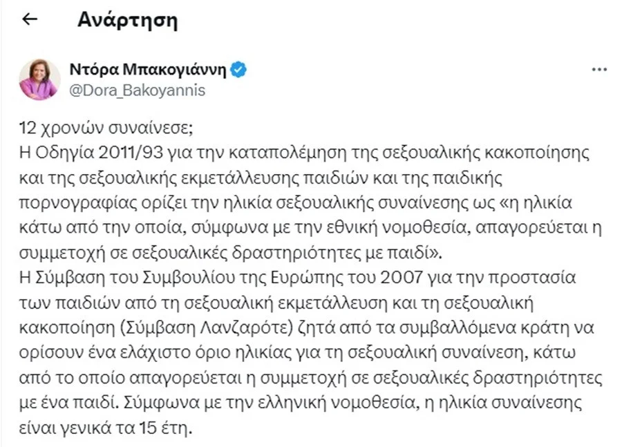 Η Ντόρα Μπακογιάννη εξετάζει το νομικό και ρυθμιστικό πλαίσιο που αφορά τη σεξουαλική εκμετάλλευση παιδιών και την παιδική πορνογραφία… Και εκφράζει αυστηρή κριτική για την εισαγγελική πρόταση «αθώωσης» του Ηλία Μίχου αναρωτιόμενη… «12 χρονών συναίνεσε;».
